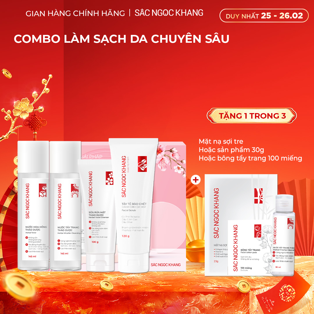 Combo Làm Sạch Da Chuyên Sâu Sắc Ngọc Khang (Sữa rửa mặt Thảo Dược 100g + Nước Hoa Hồng Thảo Dược 145ml + Nước Tẩy Trang Thảo Dược 145ml + Tẩy TBC 120g)