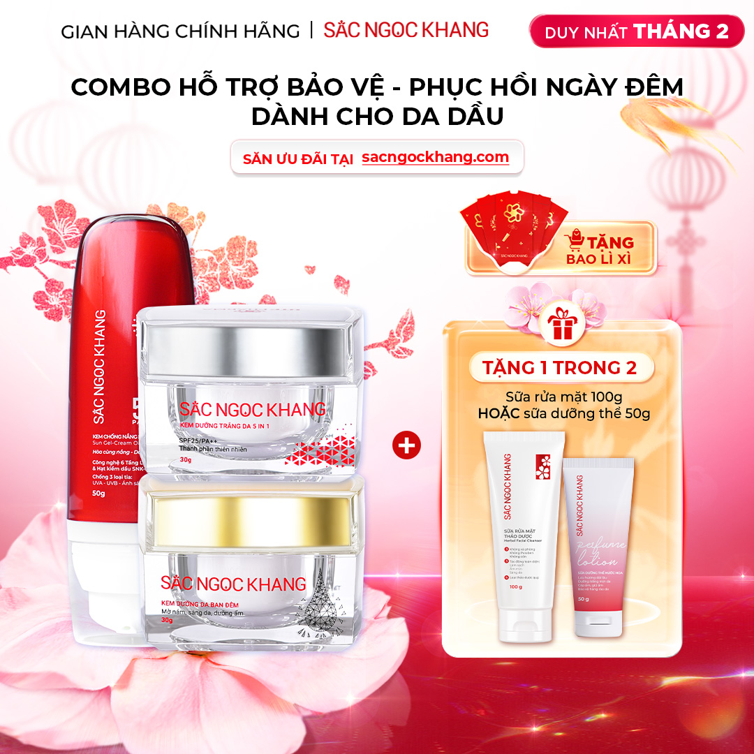 Combo Dưỡng Da Ngày Và Đêm Sắc Ngọc Khang (Kem Dưỡng Da Ban Đêm 30g và Kem Dưỡng Da Ban Ngày 5in1 30g, tặng Sữa rửa mặt 100g hoặc sữa dưỡng thể 50g)