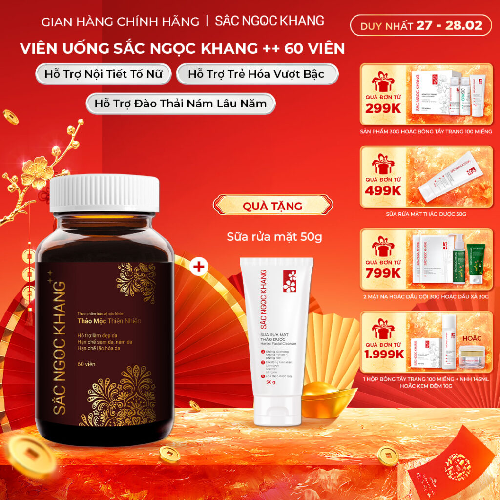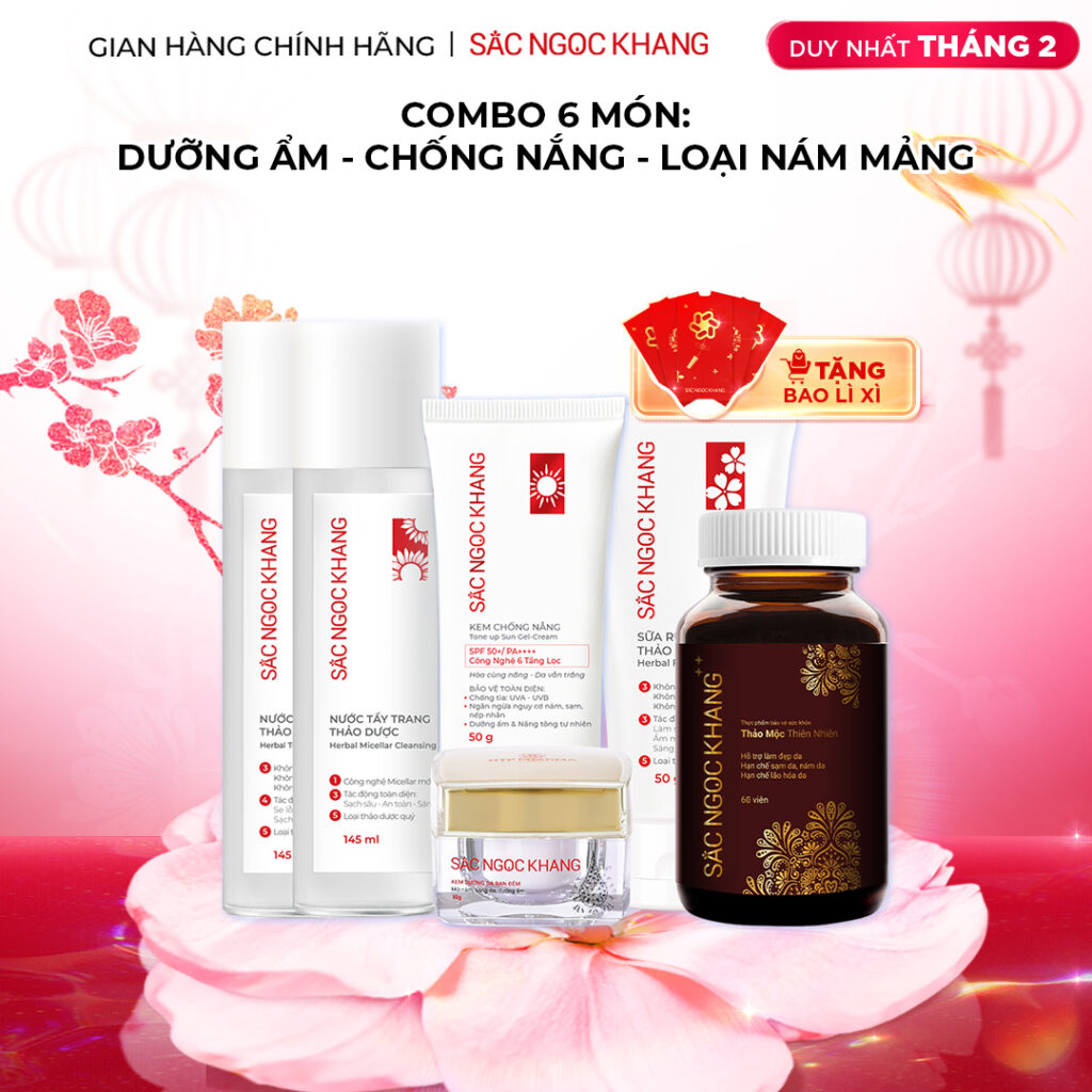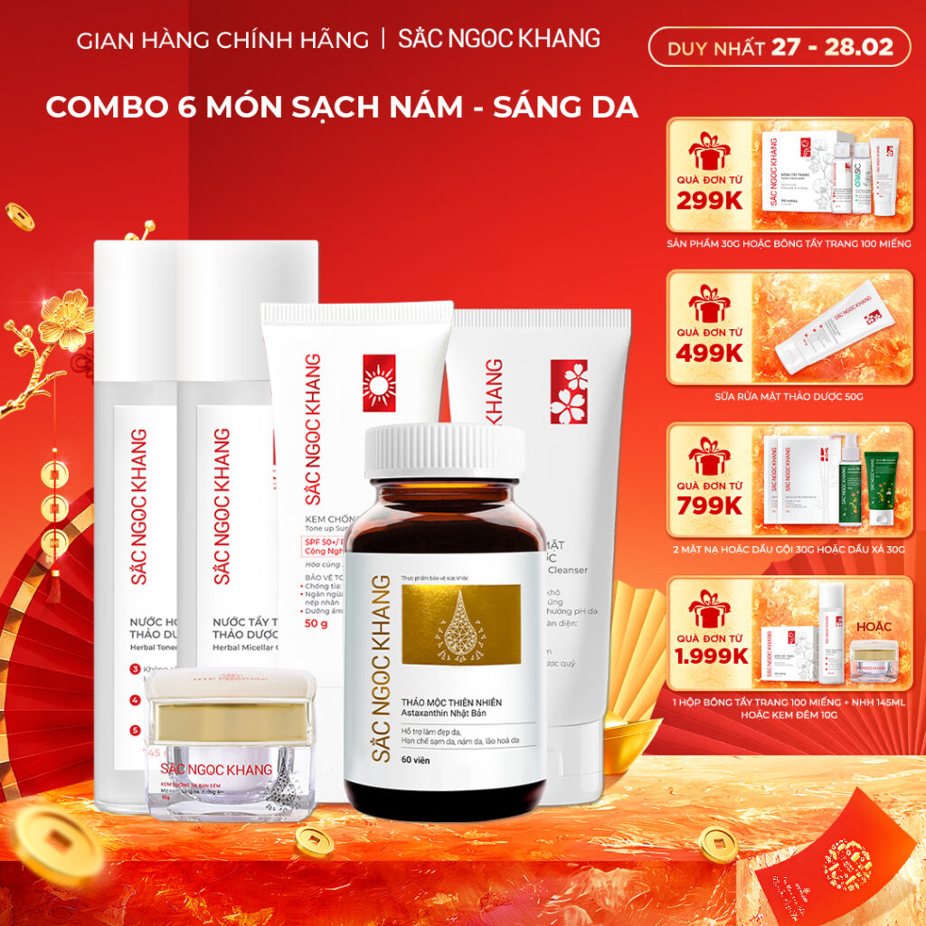 Combo Mờ Nám, Đẹp Da Sắc Ngọc Khang: Sữa Rửa Mặt 50g, Nước Tẩy Trang Thảo Dược 145ml, Nước Hoa Hồng Thảo Dược 145ml, Kem Dưỡng Da Ban Đêm 10g, Kem Chống Nắng “Sa Mạc”, Viên Uống Sắc Ngọc Khang ++ 60v (Phiên bản cao cấp)