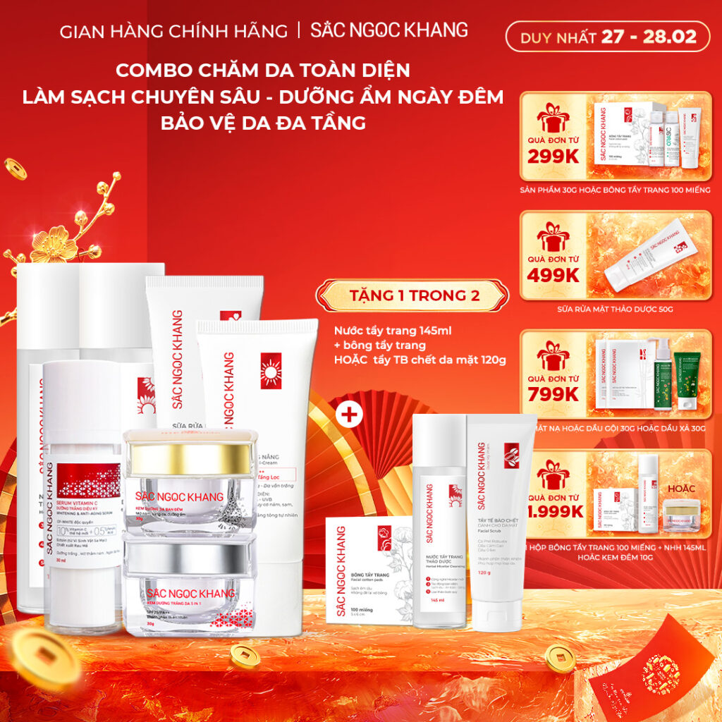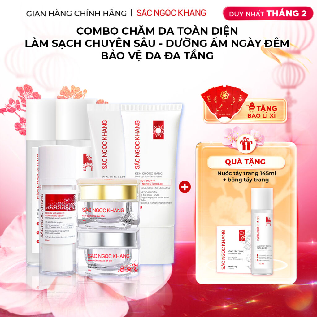 Combo 7 Sản Phẩm Chăm Sóc Da Toàn Diện Chuyên Sâu Sắc Ngọc Khang (Nước Tẩy Trang Thảo Dược, Sữa Rửa Mặt Thảo Dược, Nước Hoa Hồng Thảo Dược, Serum Siêu Dưỡng Trắng Vitamin C, Kem Dưỡng Da 5 In 1, Kem Dưỡng Ban Đêm, Kem Chống Nắng)