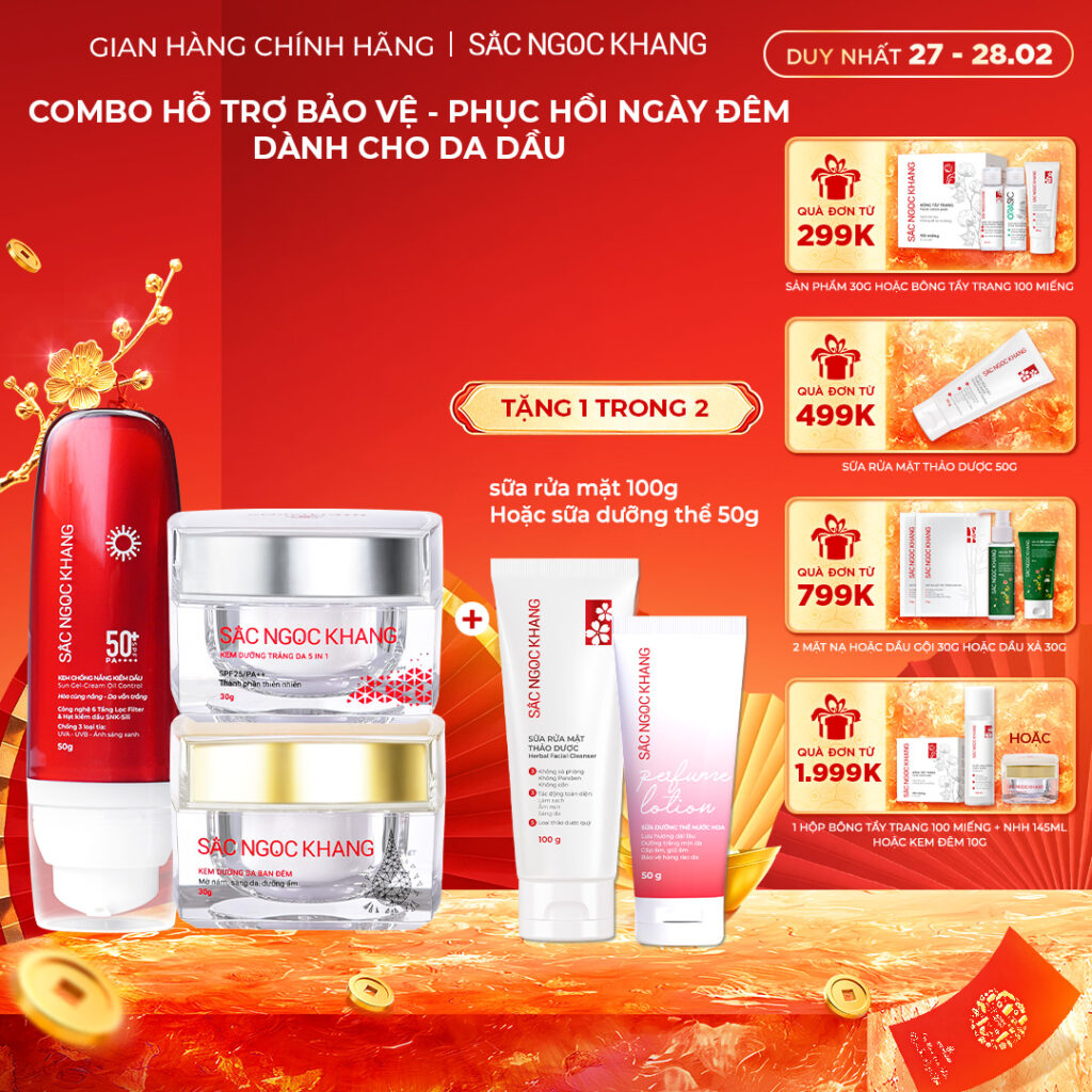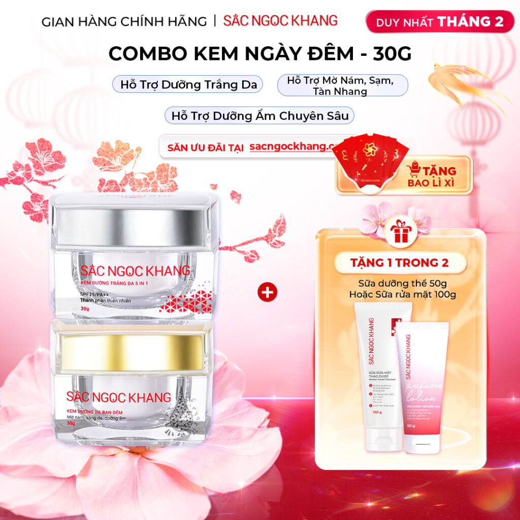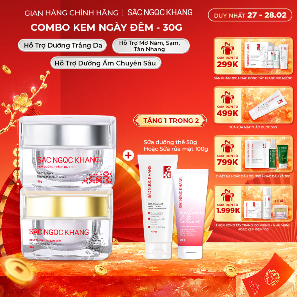Combo Dưỡng Da Ngày Và Đêm Sắc Ngọc Khang (Kem Dưỡng Da Ban Đêm 30g và Kem Dưỡng Da Ban Ngày 5in1 30g, tặng Sữa rửa mặt 100g hoặc sữa dưỡng thể 50g)