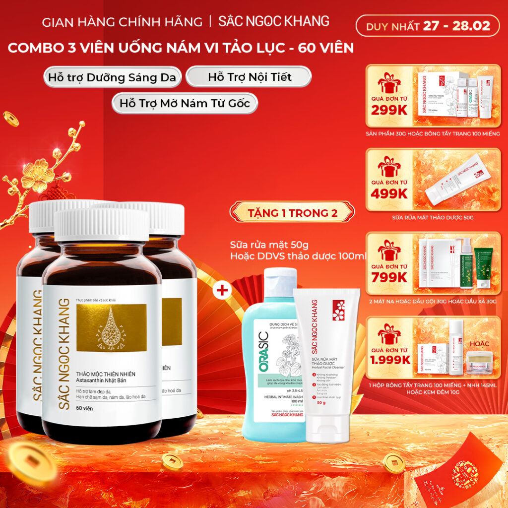 Combo Toàn Diện Mờ Nám, Đẹp Da Sắc Ngọc Khang: Nước tẩy trang 145ml, sữa rửa mặt 50g, nước hoa hồng 145ml, kem chống nắng 50g, kem dưỡng da ban đêm 10g, viên uống vi tảo lục 60v (phiên bản thường)
