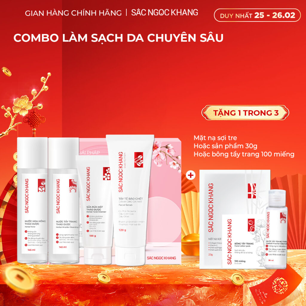 Combo Làm Sạch Da Chuyên Sâu Sắc Ngọc Khang (Sữa rửa mặt Thảo Dược 100g + Nước Hoa Hồng Thảo Dược 145ml + Nước Tẩy Trang Thảo Dược 145ml + Tẩy TBC 120g)