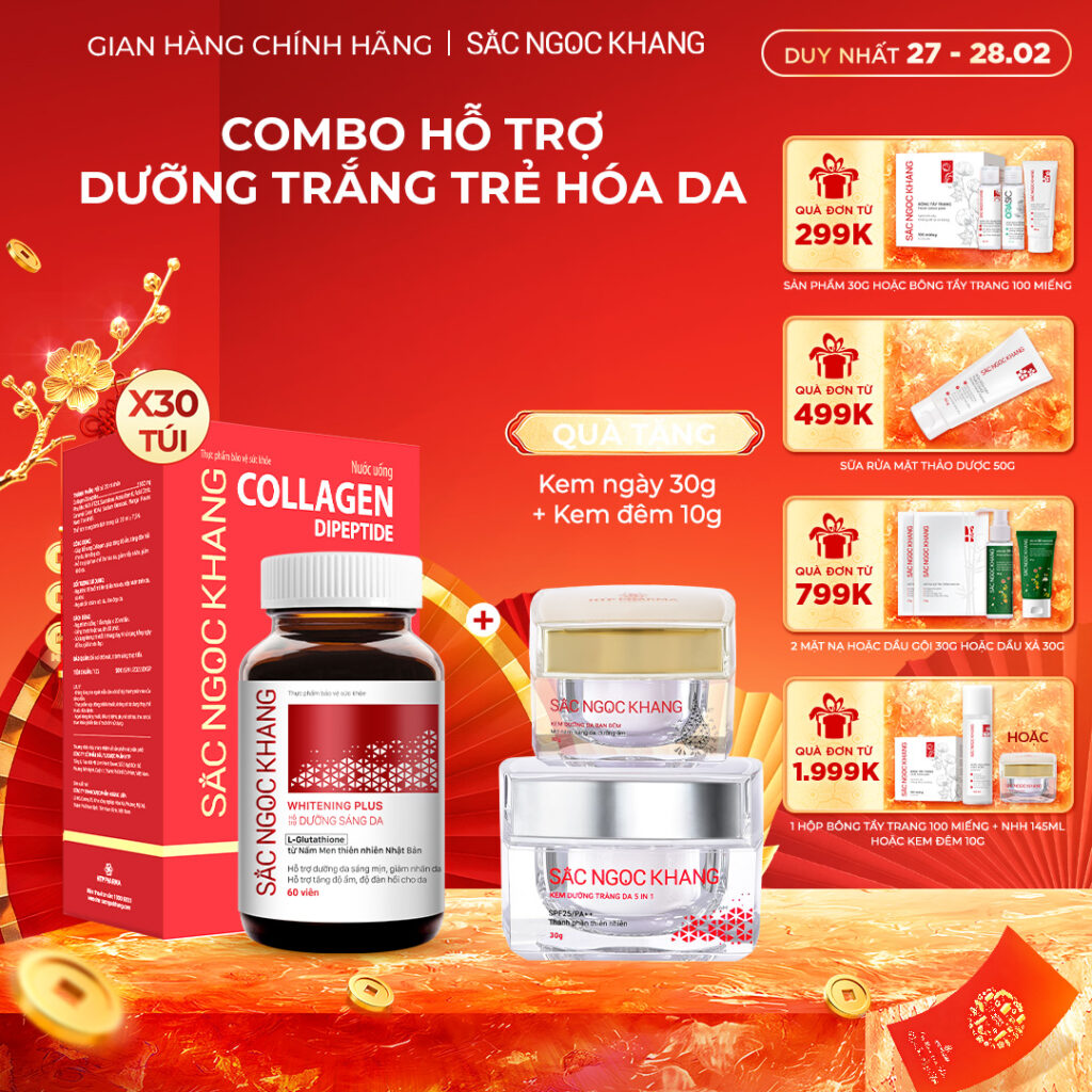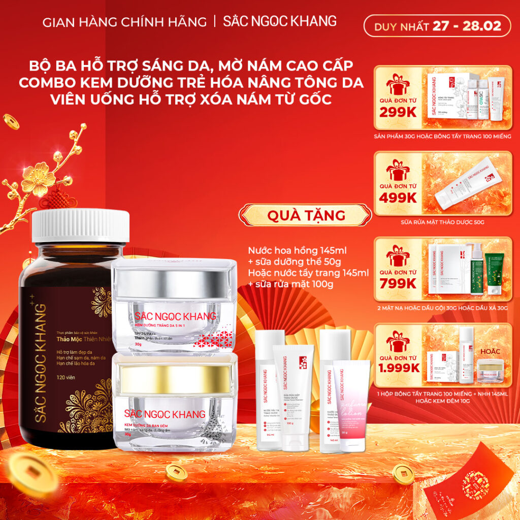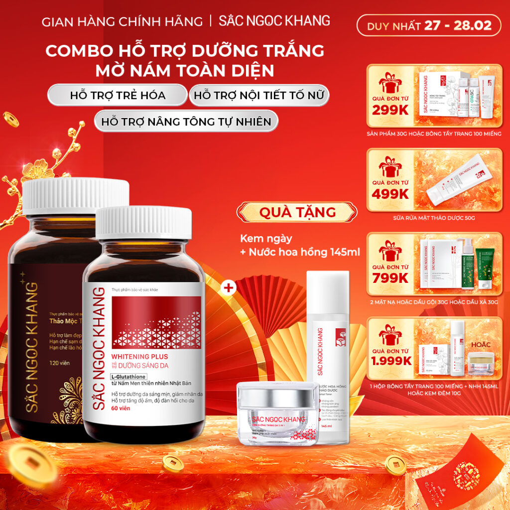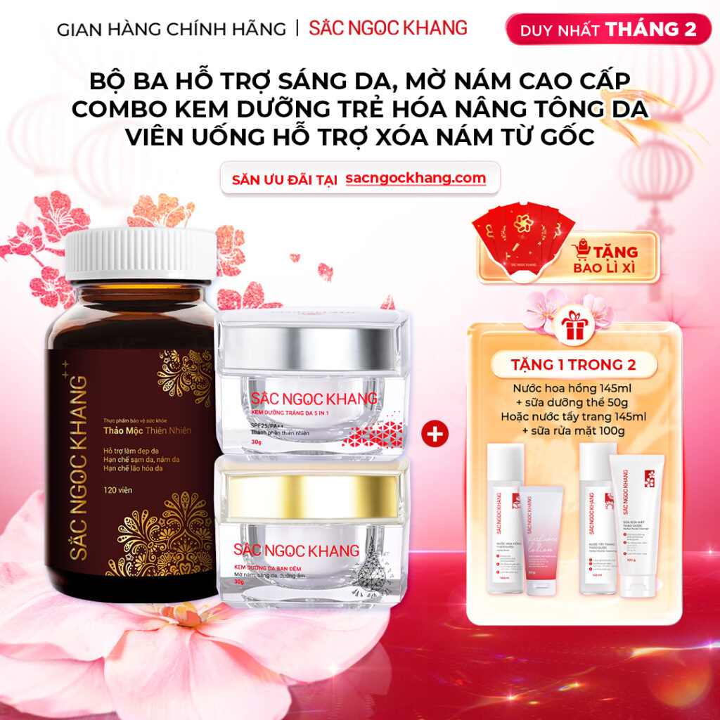 Combo Mờ Nám Dưỡng Trắng Cao Cấp Sắc Ngọc Khang: Viên Uống Sắc Ngọc Khang ++, Kem Dưỡng Da Ban Đêm, Kem Dưỡng Da Ban Ngày