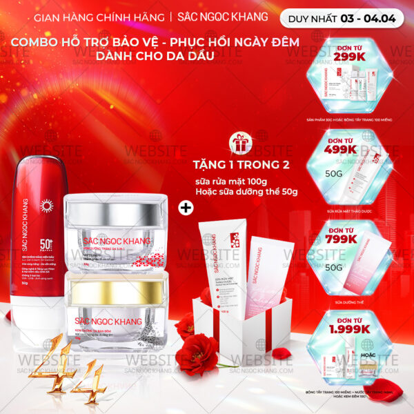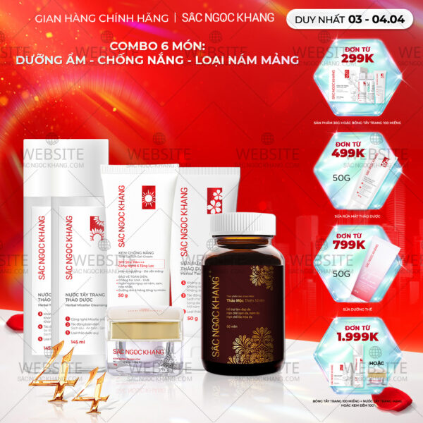 Combo 7 Sản Phẩm Chăm Sóc Da Toàn Diện Chuyên Sâu Sắc Ngọc Khang (Nước Tẩy Trang Thảo Dược, Sữa Rửa Mặt Thảo Dược, Nước Hoa Hồng Thảo Dược, Serum Siêu Dưỡng Trắng Vitamin C, Kem Dưỡng Da 5 In 1, Kem Dưỡng Ban Đêm, Kem Chống Nắng)