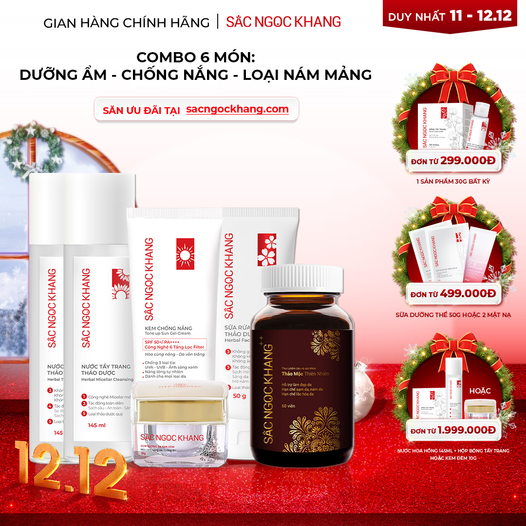 Combo Mờ Nám, Đẹp Da Sắc Ngọc Khang: Sữa Rửa Mặt 50g, Nước Tẩy Trang Thảo Dược 145ml, Nước Hoa Hồng Thảo Dược 145ml, Kem Dưỡng Da Ban Đêm 10g, Kem Chống Nắng “Sa Mạc”, Viên Uống Sắc Ngọc Khang ++ 60v (Phiên bản cao cấp)