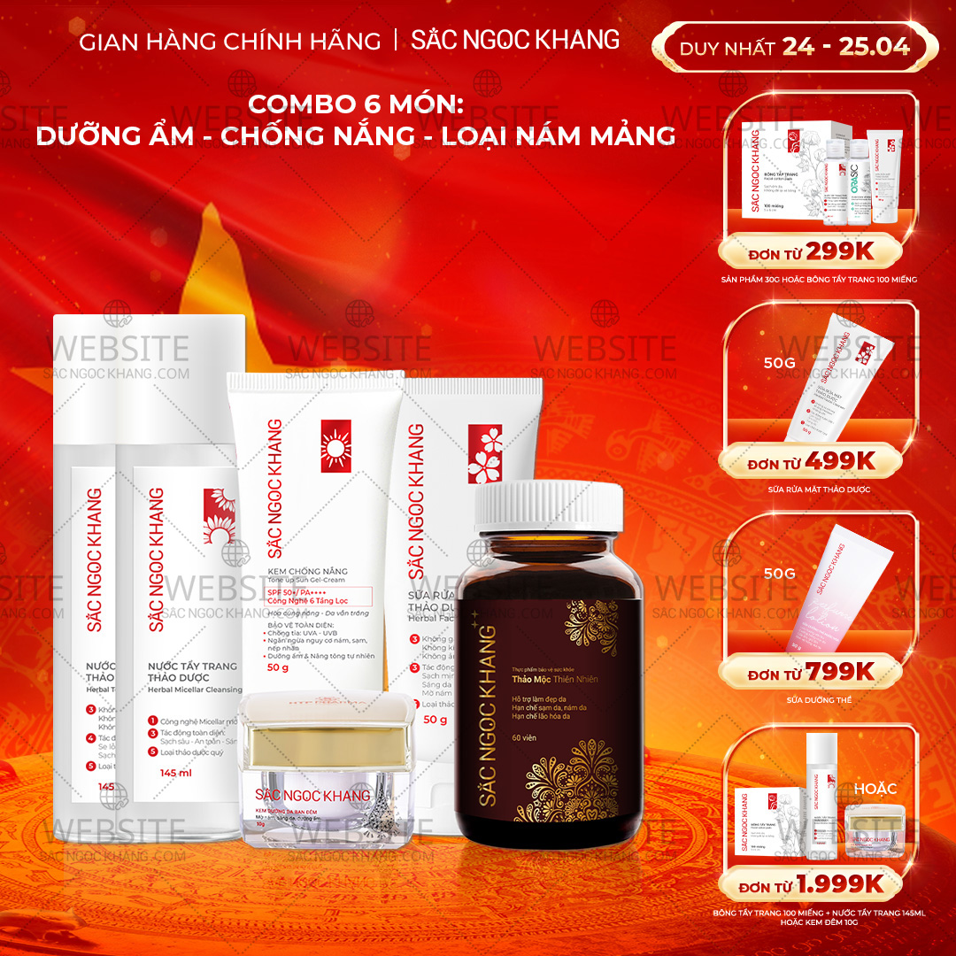 Combo Mờ Nám, Đẹp Da Sắc Ngọc Khang: Sữa Rửa Mặt 50g, Nước Tẩy Trang Thảo Dược 145ml, Nước Hoa Hồng Thảo Dược 145ml, Kem Dưỡng Da Ban Đêm 10g, Kem Chống Nắng “Sa Mạc”, Viên Uống Sắc Ngọc Khang ++ 60v (Phiên bản cao cấp)