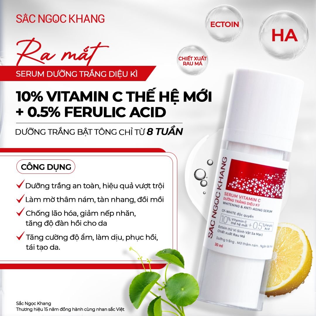 ⇒ Serum Vitamin C Dưỡng Trắng Diệu Kỳ Sắc Ngọc Khang – “chiến binh” không thể thiếu trên hành trình chinh phục làn da sáng mịn hoàn hảo, “tạm biệt” làn da không đều màu, thâm sạm, nám, tàn nhang nhờ công thức độc quyền với 3 tác động mạnh mẽ: