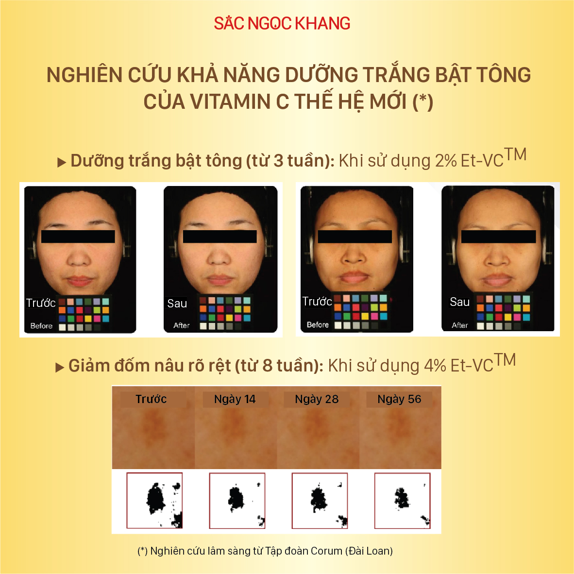 Nhận thấy rõ rệt những bất lợi này, đội ngũ Sắc Ngọc Khang đã tiến hành nghiên cứu, thử nghiệm qua hàng trăm giờ và trở thành Thương hiệu đầu tiên tại Việt Nam ứng dụng thành công Bằng sáng chế được Mỹ công nhận với công thức hoàn toàn mới – [CF-White] độc quyền . Đây là sự kết hợp độc nhất giữa 10% Vitamin C thế hệ mới + 0.5% Ferulic Acid mang đến 2 ưu điểm cực độc đáo: